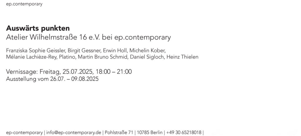 Titel: Einladung zur Ausstellung »Auswärts punkten«, das Stuttgarter Atelier Wilhelmstraße 16 zu Gast bei der ep.contemporary in Berlin. Die Eröffnung ist am 25. Juli 2025 in der Pohlstraße 71 (26. Juli – 09. August 2025) Jahr: 2025 Öffnungszeiten: Do - Fr: 15:00 - 18:00, Sa: 14:00 - 18:00