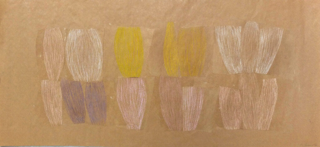 Titel: Ohne Titel Serie: Stauden Jahr: 1995 Kategorien: Arbeiten auf Papier Technik: Collage, Kreide auf Papier Größe: 40 x 87 cm