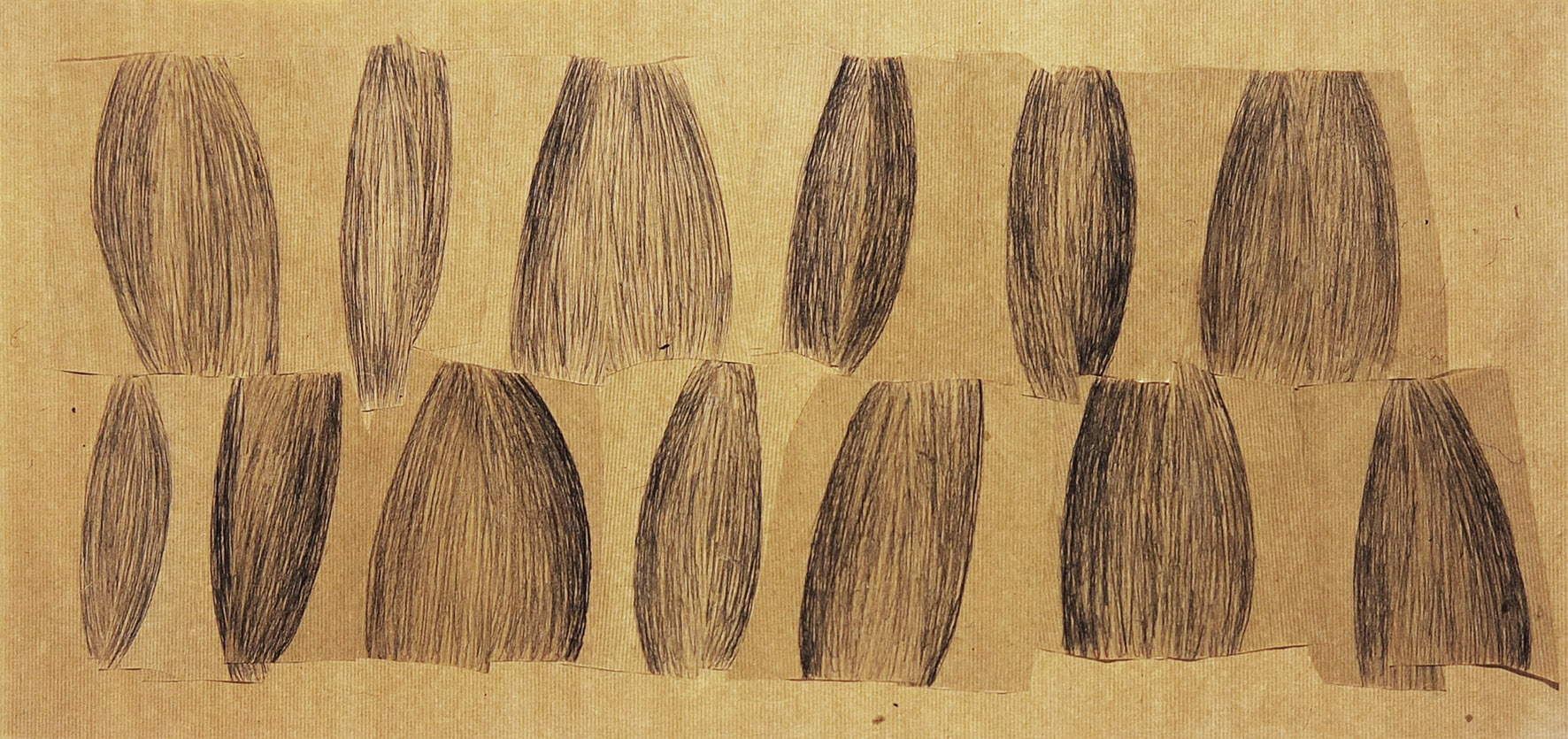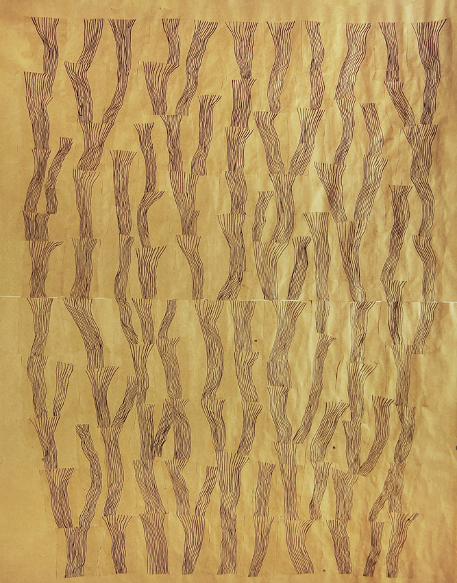 Titel: Ohne Titel Serie: Stauden Jahr: 1995 Kategorien: Arbeiten auf Papier Technik: Collage, Marker auf Papier Größe: 40 x 87 cm