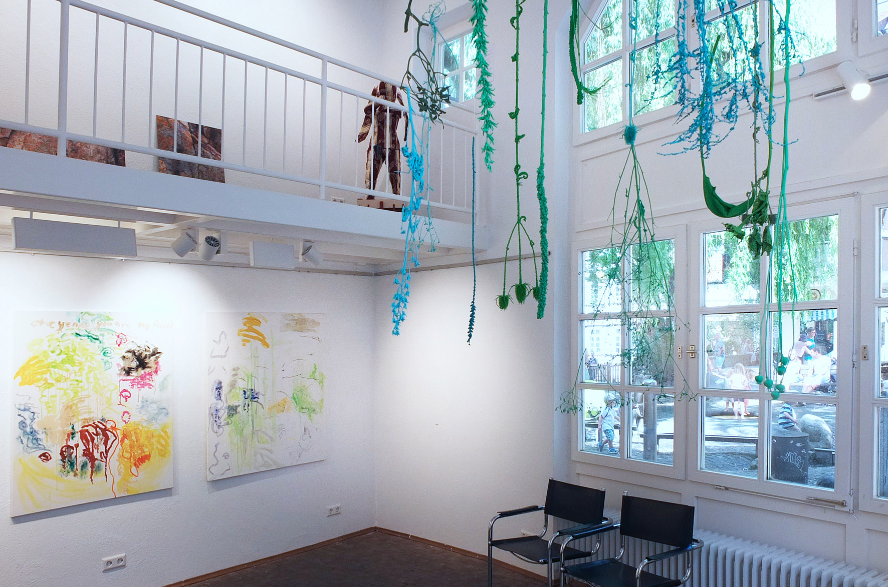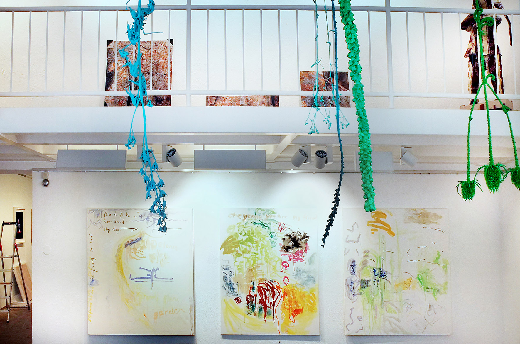 Titel: Triptychon »garden« in der Ausstellung »Lebensmittel« im Künstlerbund Tübingen Jahr: 5. Juni - 28. Juni 2025 Im Vordergrund sieht man Details der Arbeit von Susanna Messerschmidt